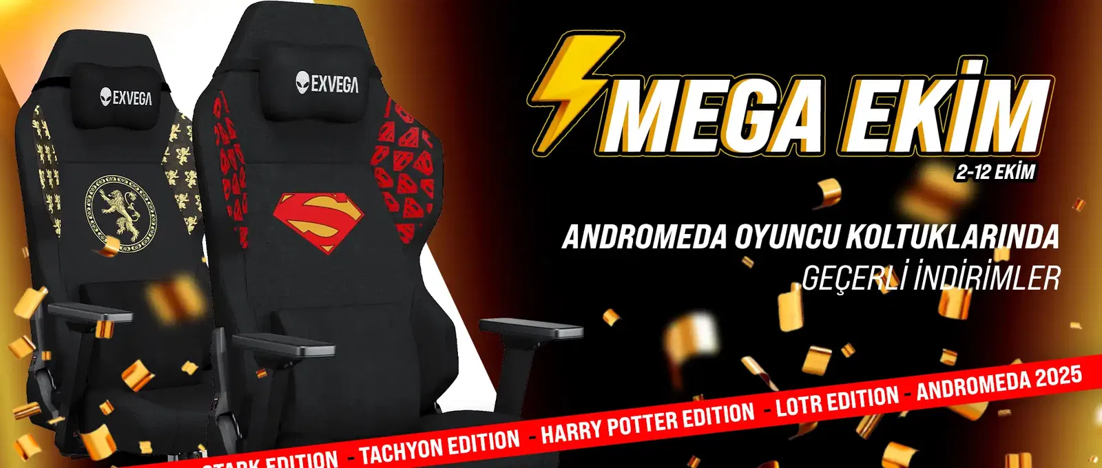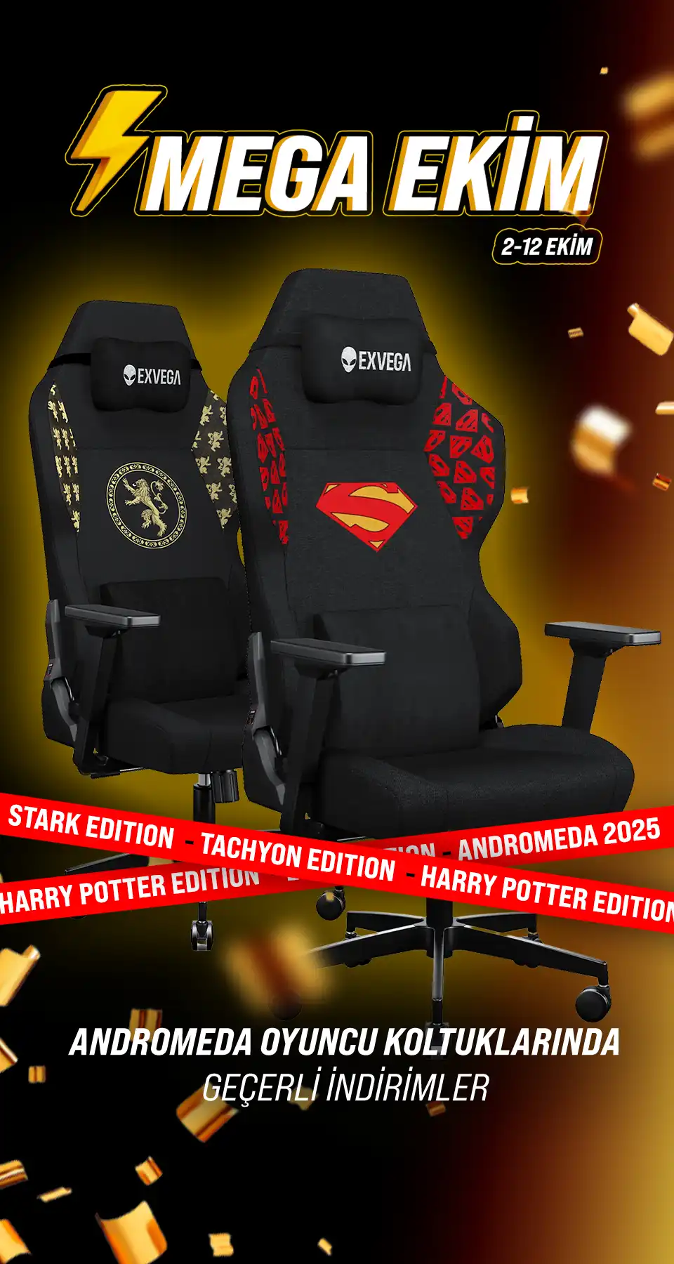 EXVEGA’nın lisanslı oyuncu koltukları, ikonik evrenleri üstün ergonomi ve kaliteyle buluşturur. Lord Of The Rings, Superman ve Game of Thrones gibi efsaneler şimdi oyun alanında seninle.
