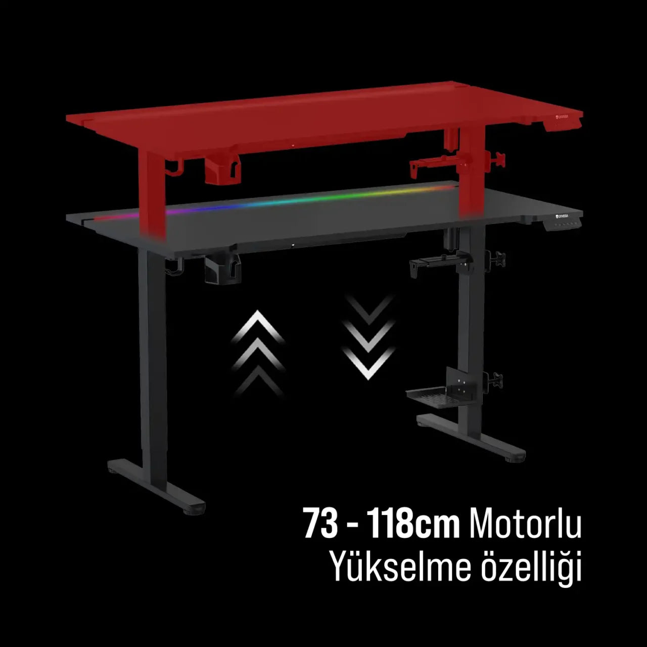 Motorlu yükseklik ayarı sayesinde masa yüksekliğini73 cm’den 118 cm’yekadar kolayca ayarlayabilirsin.İster uzun saatler oyun oynarken ister çalışırken, oturma ve ayakta çalışma modları arasında geçiş yaparak duruşunu koru.Dayanıklı metal iskeleti ve sessiz motor mekanizması sayesinde hem uzun ömürlü hem de konforlu bir kullanım sunar.