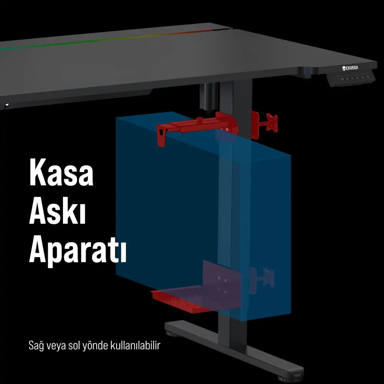Masanın altına entegre edilen kasa askı aparatı ile bilgisayar kasanı güvenli ve düzenli bir şekilde konumlandırabilirsin. Sağ veya sol tarafa monte edilebilen ayarlanabilir yapı, masa üstünde ekstra alan kazandırırken kasanın hava almasını da kolaylaştırır. Hem estetik hem de ergonomik bir çözüm sunar.
