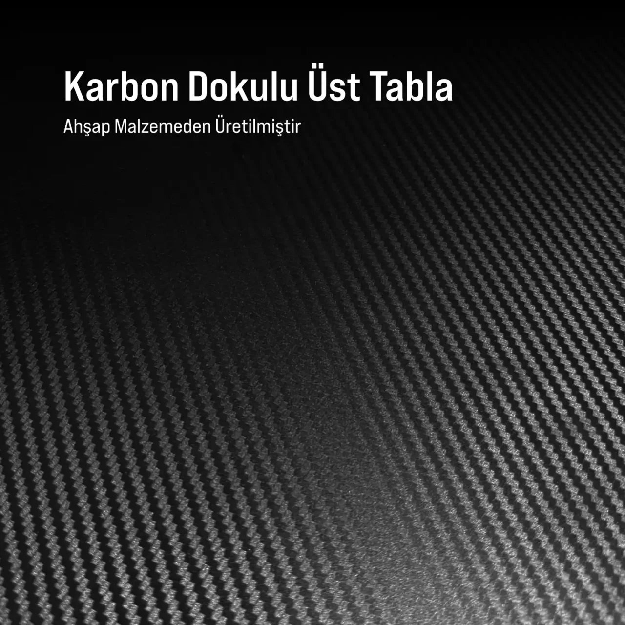 Dayanıklı ahşap malzemeden üretilen üst tabla, karbon dokulu yüzeyiyle hem şık bir görünüm hem de çizilmelere karşı ekstra direnç sağlar. Kaymaz yapısı sayesinde ekipmanlarını güvenle kullanabilir, uzun süreli performansın keyfini çıkarabilirsin. Estetikle fonksiyonelliği bir araya getiren bu yüzey, masaya premium bir hava katar.