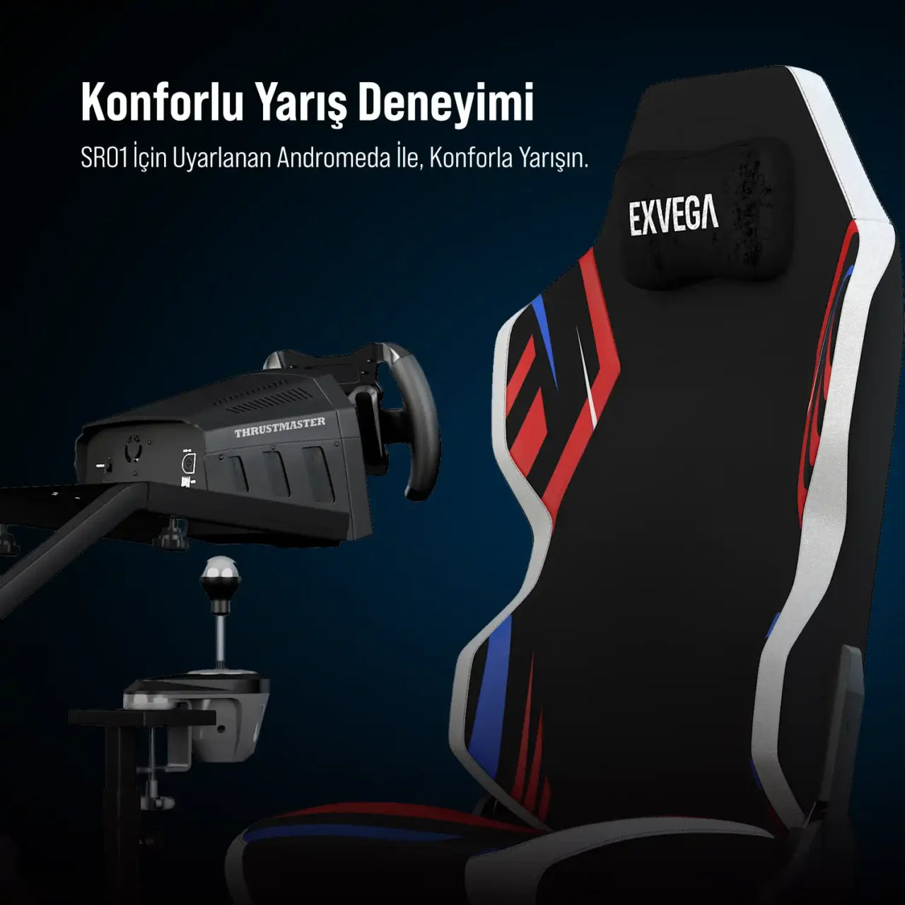 Simülatör kokpitine özel uyarlanan EXVEGA Andromeda koltuğu, uzun yarış maratonlarında üst düzey konfor sunar. Cold cure poliüretan dolgusu ile yıllara meydan okuyan dayanıklılık sağlarken, nefes alabilen dokuma kumaşı sayesinde ferah bir oturum deneyimi yaşatır. Geriye yatabilen yapısı, kişisel rahatlığı en üst seviyeye taşır ve seni her an piste hazır tutar.