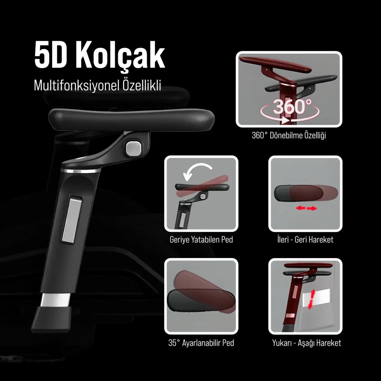 Oyun veya çalışma fark etmeksizin en yüksek konforu sunmak için tasarlanan 5D kolçak; yukarı–aşağı, ileri–geri, 35° açılı ped ayarı, geriye yatırılabilen ped ve 360° dönebilme özelliklerini bir arada sunar. Her hareket yönünde kişisel ayar yapabilme imkânı sayesinde bilek, kol ve omuz desteğinizi en ideal pozisyona getirir. Ergonomik tasarım, uzun oturumlarda yorgunluğu azaltırken dayanıklı malzemesi uzun ömürlü kullanım sağlar.