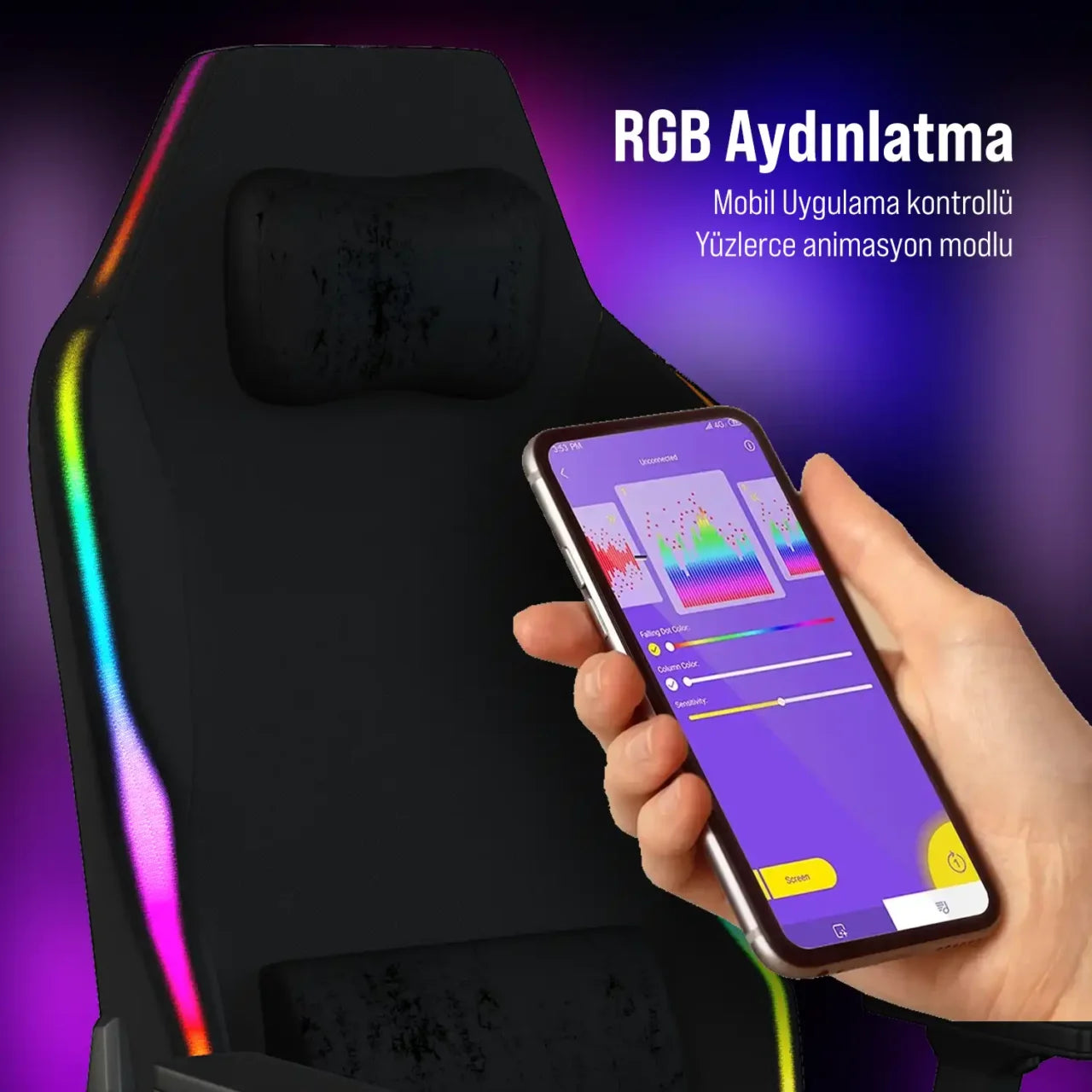 Koltuğun kenarlarına entegre edilen RGB aydınlatma sistemi, mobil uygulama üzerinden kolayca kontrol edilebilir. Yüzlerce animasyon modu ve renk seçeneği sayesinde oyun atmosferini kişiselleştir, ortamına dilediğin ruhu kat. İster sakin bir ışık akışı, ister dinamik renk geçişleri… Hepsi sadece birkaç dokunuşla senin kontrolünde!