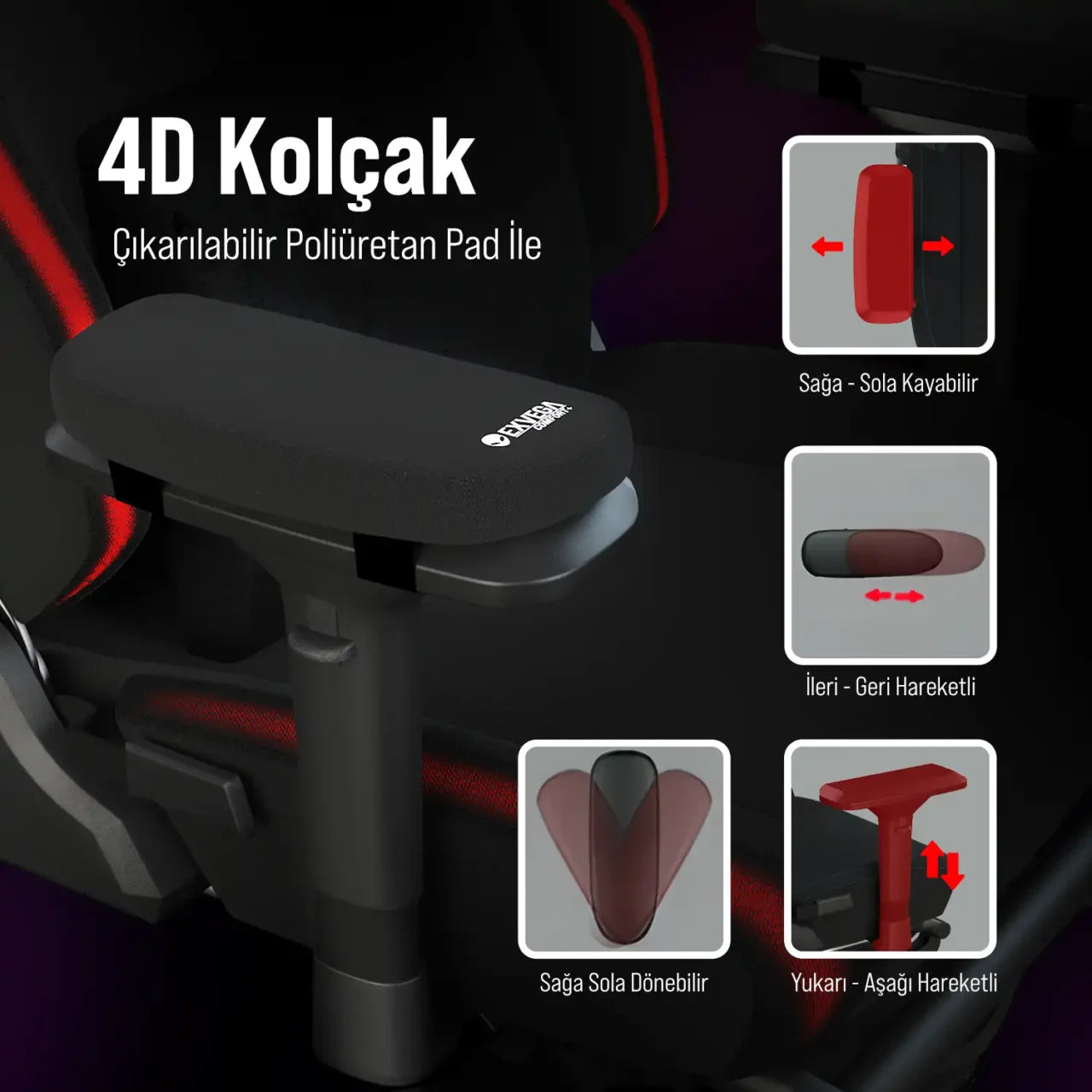 Çıkarılabilir poliüretan padli 4D kolçak, maksimum kişiselleştirme imkânı sunar. Yukarı–aşağı, ileri–geri, sağa–sol kaydırma ve döndürme hareketleriyle kollarını en rahat pozisyonda konumlandırabilirsin. Uzun süreli kullanımda bilek ve kol yorgunluğunu en aza indirerek hem oyun hem de çalışma deneyimini konforlu hale getirir.