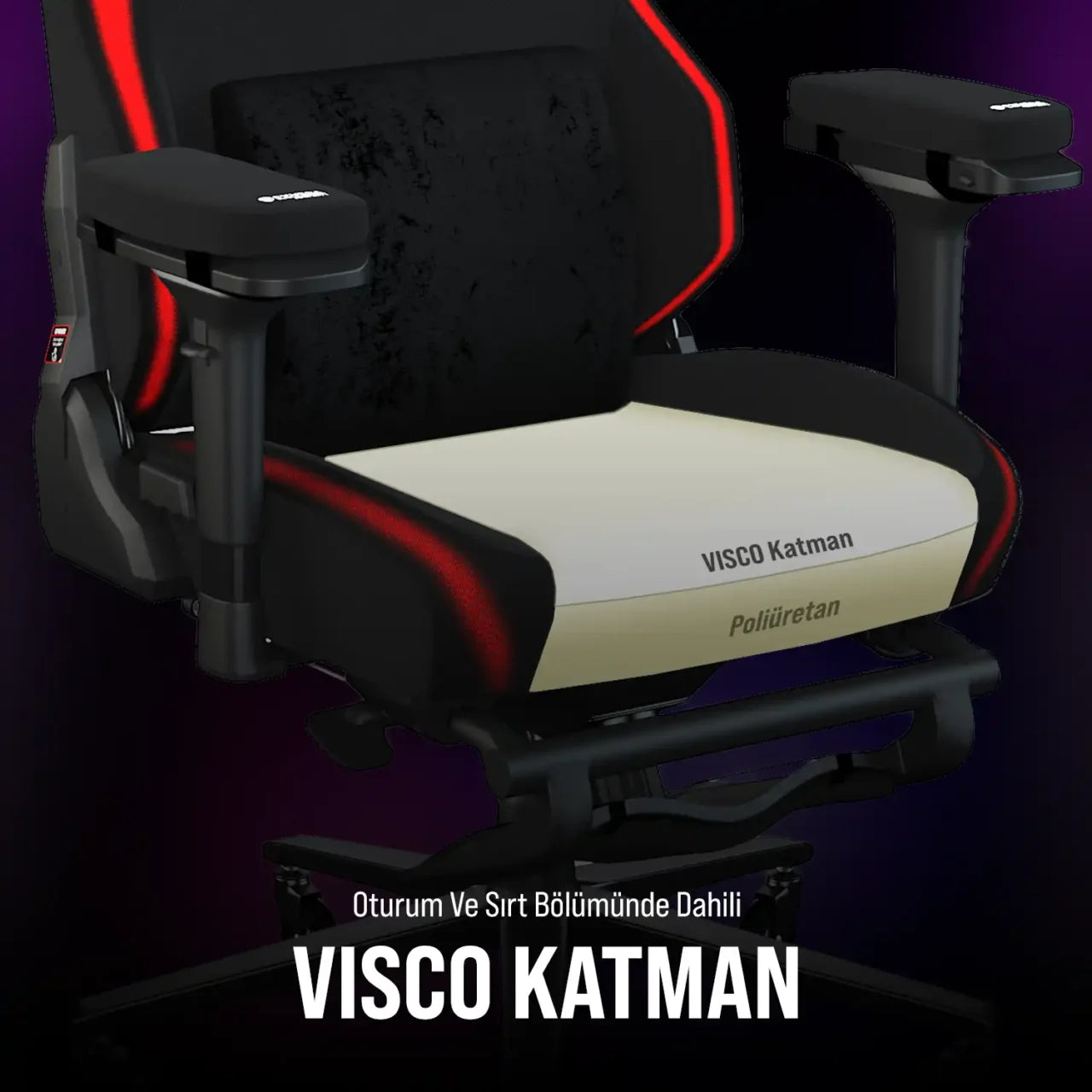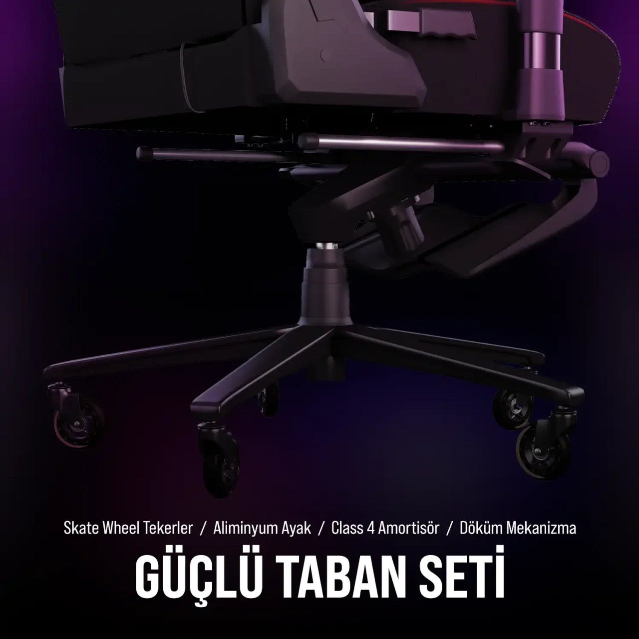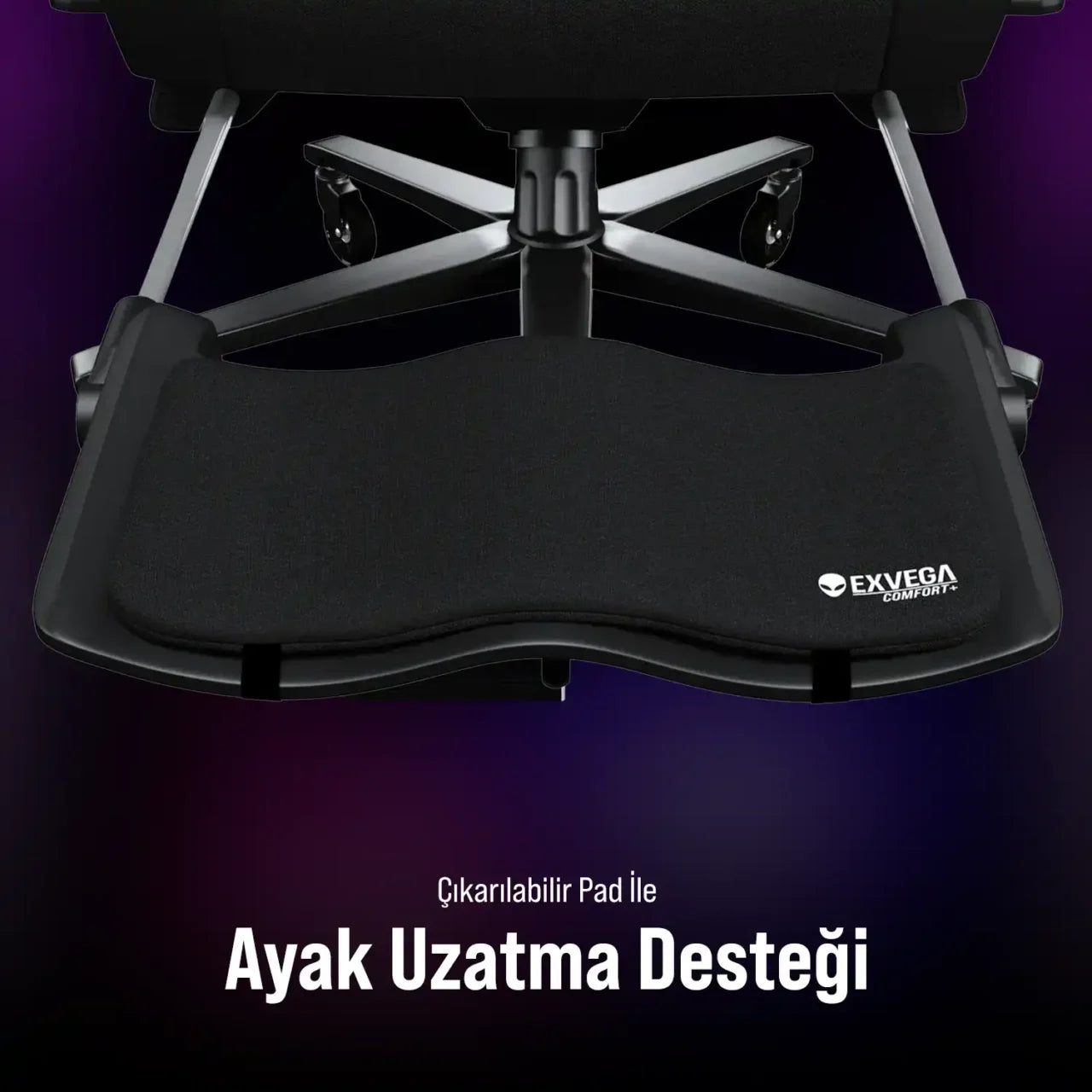 Çıkarılabilir padli ayak uzatma desteği ile konforu yeni bir seviyeye taşır. İster oyun arasında dinlen, ister film izlerken geriye yaslan; ayaklarını uzatarak tam bir rahatlama yaşa. Uzun oturumlarda yorgunluğu azaltır, koltuğunu sadece bir oyun koltuğu değil, kişisel konfor alanına dönüştürür.