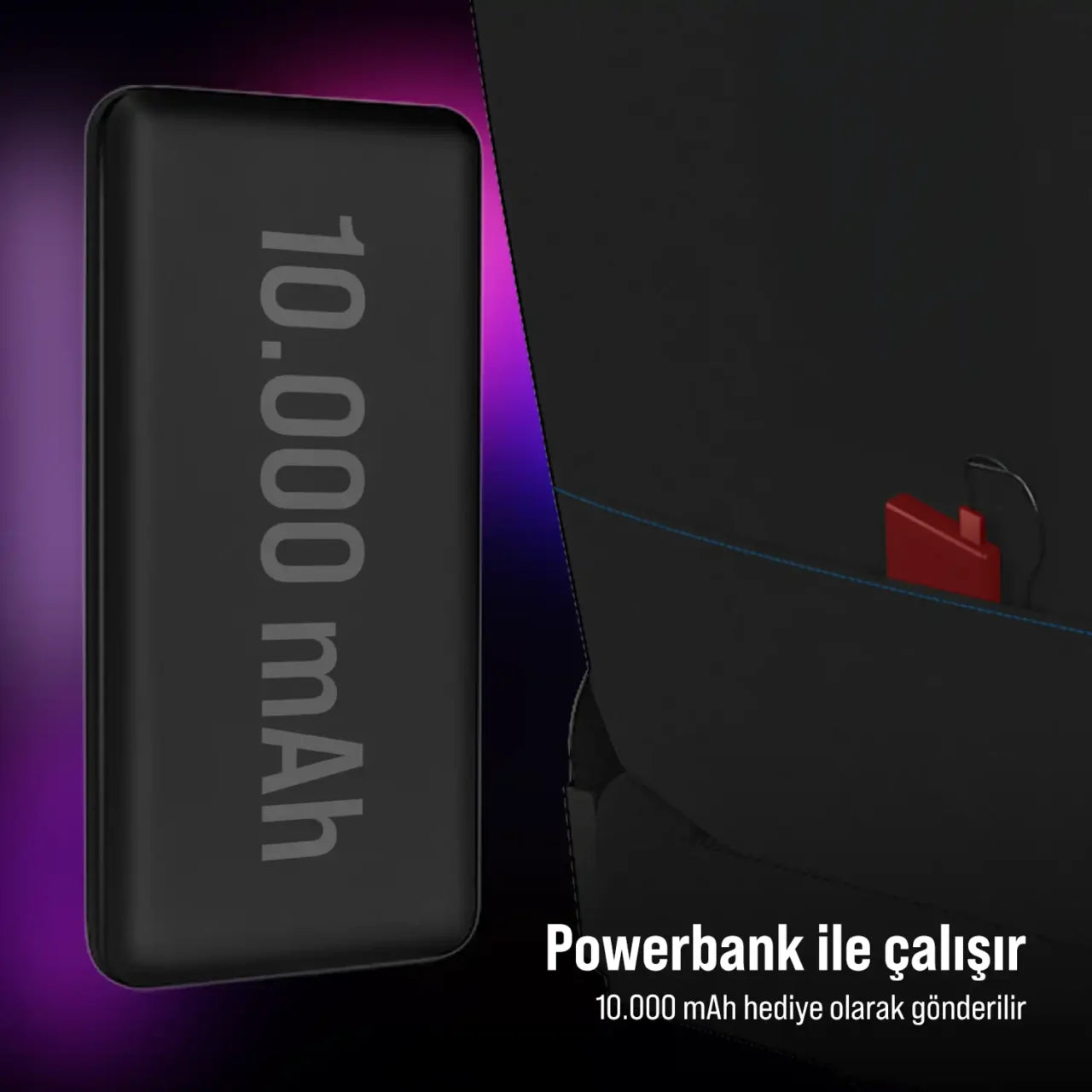 RGB Aydınlatma ve Hoparlörler taşınabilir güç kaynağı üzerinden çalışır. Ürünle birlikte hediye edilen 10.000 mAh powerbank, tek şarjla 3 saate kadar kesintisiz müzik dinleme ve ışıklandırma deneyimi sunar.